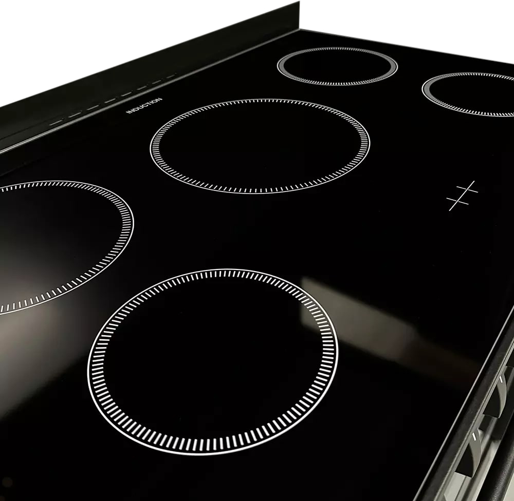 Индукционная варочная панель из стеклокерамики с пятью зонами готовки обеспечивает мгновенный нагрев и точный контроль температуры. Центральная конфорка мощностью 4.5 кВт и задняя правая на 3 кВт справятся с крупными кастрюлями и воками, а две передние по 1.75 кВт и задняя левая 1.1 кВт удобны для посуды малого и среднего размера. Режим Booster даёт мгновенное усиление мощности, чтобы быстро довести воду до кипения. Сенсорные и поворотные переключатели вместе с электронно-механическим управлением, дисплеем и электронными часами делают настройку простой и наглядной.