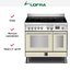 Устройства с тремя духовками также имеют один основной и две дополнительных шкафа разного объема: например, плиты Bertazzoni оснащены большой духовкой объемом 69 литров, средней объемом 54 литра и малой объемом 24 литра. Духовки располагаются в два ряда: две меньшие духовки в одном ряду, большая и ящик для посуды в другом.