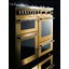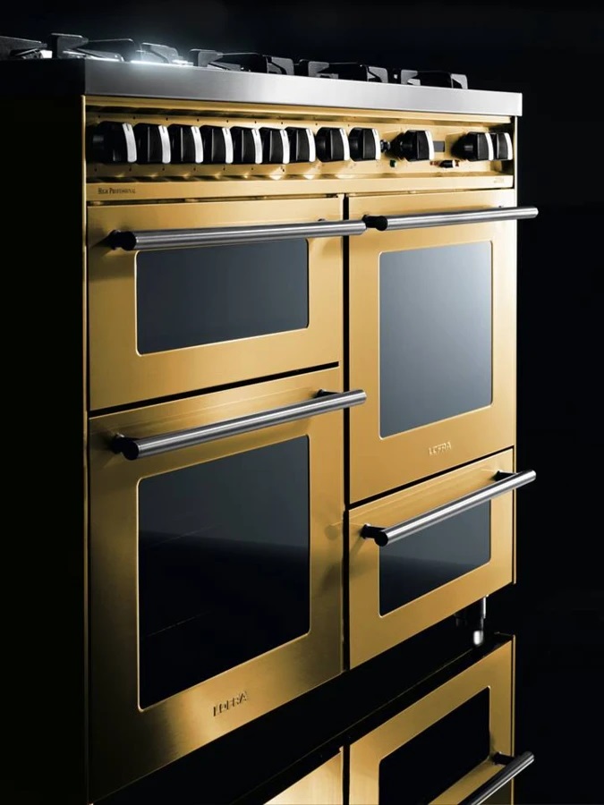Устройства с тремя духовками также имеют один основной и две дополнительных шкафа разного объема: например, плиты Bertazzoni оснащены большой духовкой объемом 69 литров, средней объемом 54 литра и малой объемом 24 литра. Духовки располагаются в два ряда: две меньшие духовки в одном ряду, большая и ящик для посуды в другом.