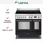 Устройства с тремя духовками также имеют один основной и две дополнительных шкафа разного объема: например, плиты Bertazzoni оснащены большой духовкой объемом 69 литров, средней объемом 54 литра и малой объемом 24 литра. Духовки располагаются в два ряда: две меньшие духовки в одном ряду, большая и ящик для посуды в другом.