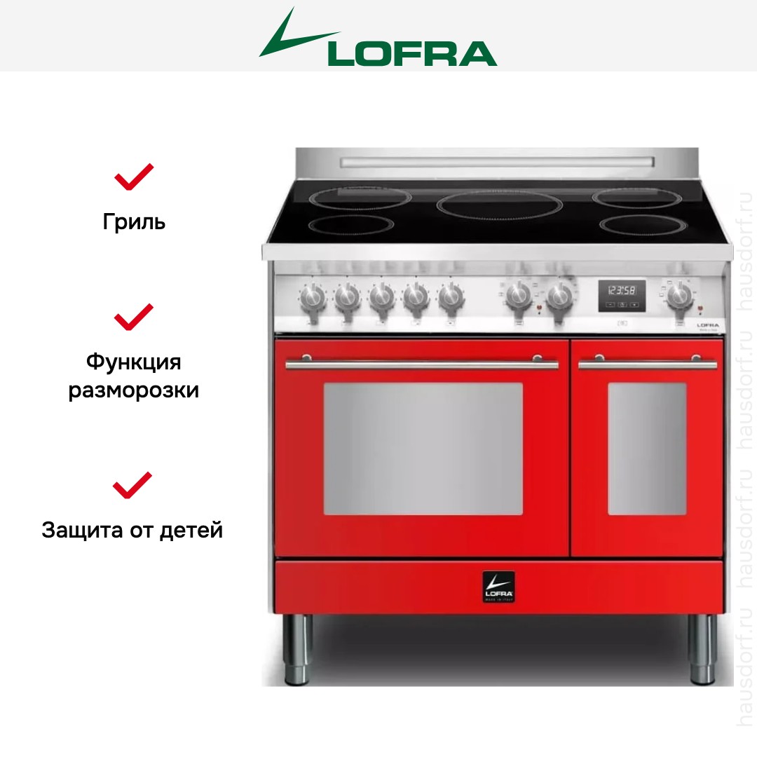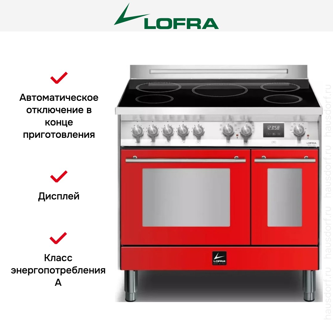 Электрическая плита Lofra PRD96MFTE/5I — отличный выбор как для квартиры, так и для частного дома. Цвет корпуса красный, он гармонично сочетается с мебелью и техникой похожих оттенков, а также может интересно выглядеть на контрасте с ними. Для управления используется удобная и понятная электронно-механическая система. Благодаря ей выбирать режимы приготовления и настраивать параметры температуры очень просто. Основная информация о процессе отображается на дисплее. Переключатели не только выполняют техническую функцию, но и поддерживают общий дизайн; тип элементов: сенсорные + поворотные.