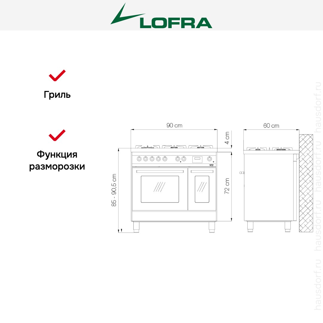 Варочный центр Лофра оборудован несколькими духовками; одну из них можно использовать как основную на постоянной основе, другие как дополнительные. Тип нагрева в камере — электрический. Большое внутреннее пространство позволяет готовить сразу несколько блюд или целиком запекать птицу, использовать объемную посуду. Вместимость составляет 107 л. Размещайте противни на разной высоте в зависимости от режима или желаемого результата. Общее количество уровней: 4. Основные функции, которые уже заложены производителем: Освещение, Работа вентилятора, Верхний и нижний нагрев, Гриль + вентилятор, Нижний нагрев, Размораживание, Конвекция, Гриль, Конвекция с кольцевым нагревательным элементом, Большой электрический гриль, Малый гриль, Верхний нагрев.