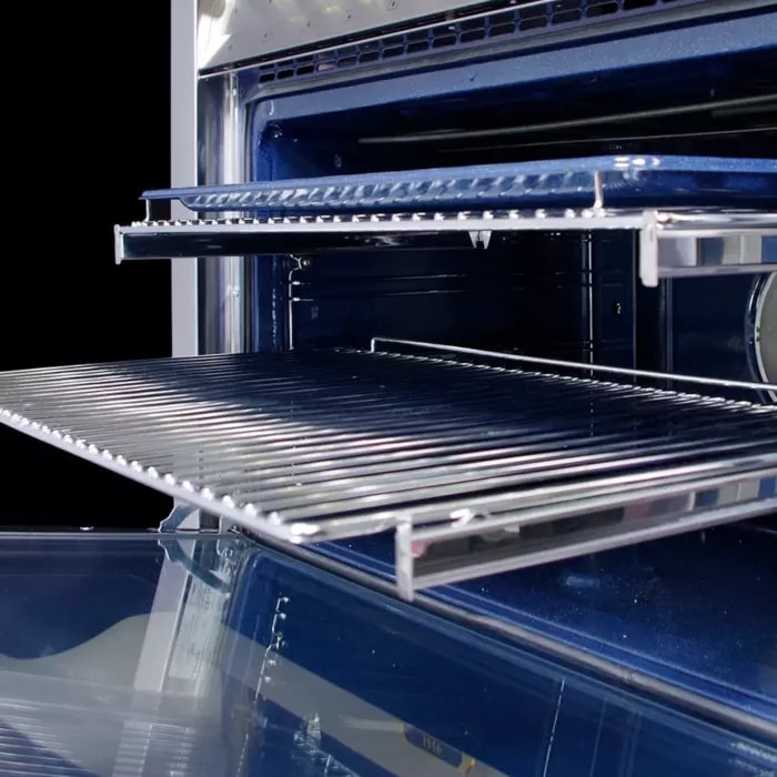 Телескопические направляющие представляют собой металлические полозья, которые можно выдвинуть из камеры вместе с находящимся на них противнем. Это самый безопасный вариант, поскольку пользователь касается противней только снаружи, не помещая руки в нагретую камеру. Благодаря специальным фиксаторам готовое блюдо можно оставить для остывания, не убирая его с направляющих.