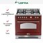 Устройства с тремя духовками также имеют один основной и две дополнительных шкафа разного объема: например, плиты Bertazzoni оснащены большой духовкой объемом 69 литров, средней объемом 54 литра и малой объемом 24 литра. Духовки располагаются в два ряда: две меньшие духовки в одном ряду, большая и ящик для посуды в другом.