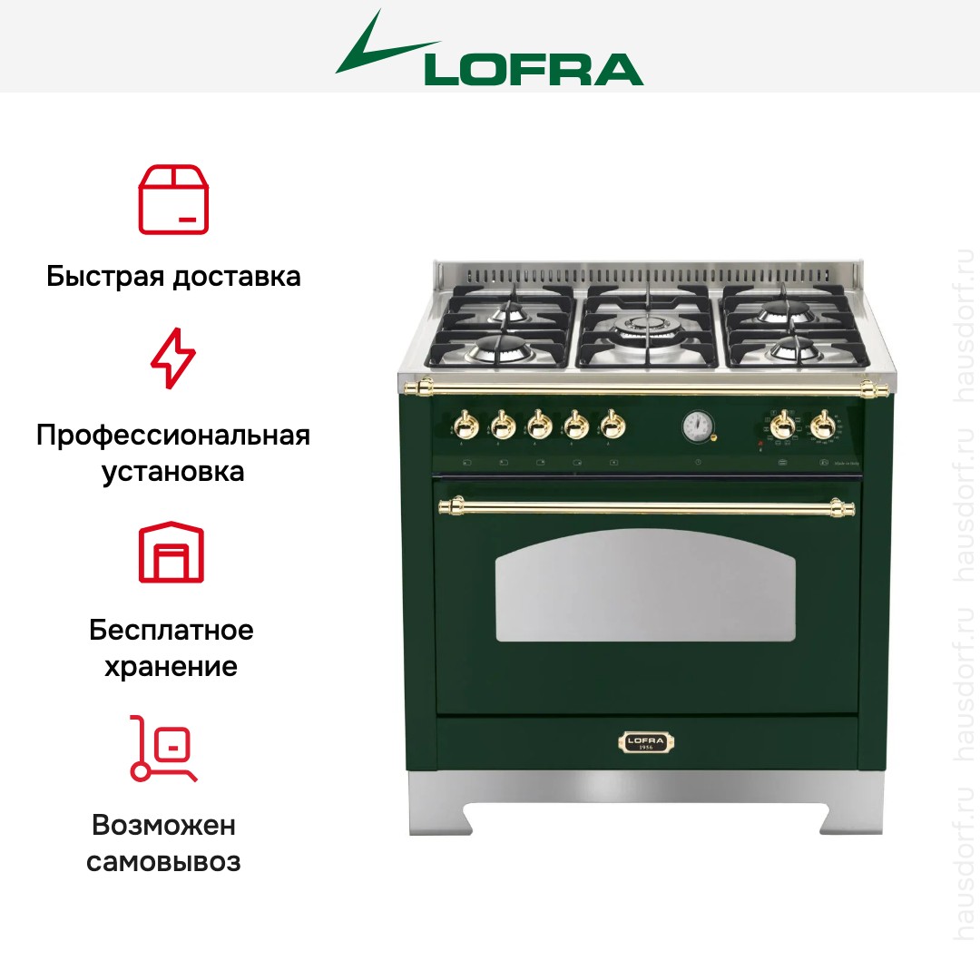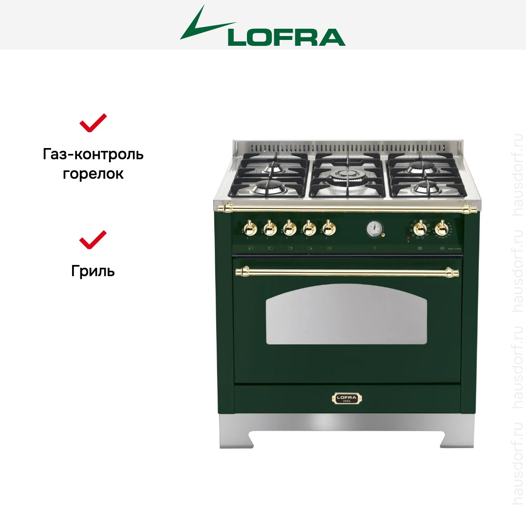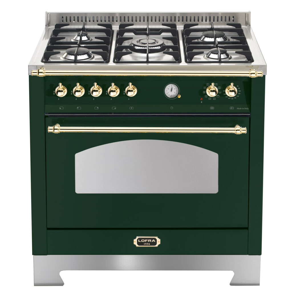 Комбинированная плита Lofra RVG96MFT/Ci Brass — отличный выбор как для квартиры, так и для частного дома. Цвет корпуса зеленый, он гармонично сочетается с мебелью и техникой похожих оттенков, а также может интересно выглядеть на контрасте с ними. Для управления используется удобная и понятная механическая система. Благодаря ей выбирать режимы приготовления и настраивать параметры температуры очень просто. Переключатели не только выполняют техническую функцию, но и поддерживают общий дизайн; тип элементов: поворотные.