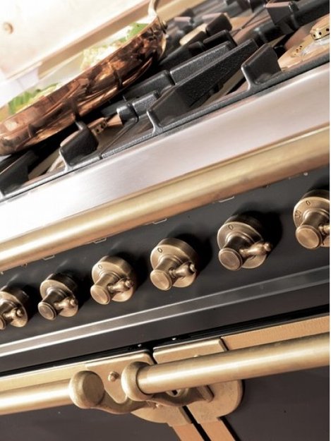Гораздо разнообразнее представлена фурнитура в моделях в классическом, средиземноморском, деревенском или ретро-дизайне. Так, модели производства Lofra оснащаются фигурными рейлингами и поворотными переключателями цвета латуни, состаренного серебра, хрома, золота. В варочных центрах La Cornue интерес представляет круглая накладная ручка дверцы духовки серебристого цвета. Фурнитурой в стиле ретро оснащаются варочные центры производства Smeg, Kaiser, Bertazzoni, но особенно разнообразны и оригинальны модели производства итальянской компании Restart с фурнитурой из меди и латуни. Каждая такая модель изготавливается по индивидуальному проекту, и покупатель может выбрать цвет и форму переключателей, дверцы и ручек духовых шкафов и другие элементы дизайна.