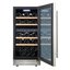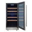 Стеклянная дверь — дополнительный изящный штрих к общему дизайну модели. Специальное покрытие защищает вино от влияния ультрафиолетовых лучей, которые проникают, если шкаф находится в солнечной комнате. Цвет корпуса — металл. Дверь можно перевесить на другую сторону, поэтому вариантов размещения его в доме становится больше.