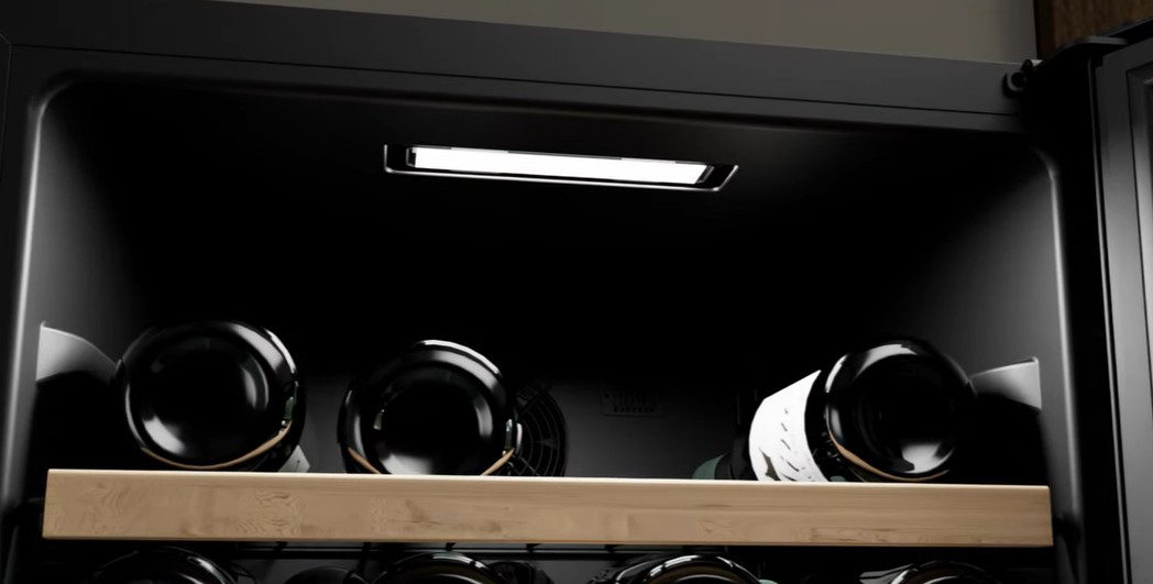 Кнопки для управления подсветкой выносятся на панель управления. Лампы синего, белого или голубого цветов могут располагаться в верхней части камеры или на боковых сторонах. Дополнительное освещение может устанавливаться в винных холодильниках с зоной для сервировки: она обеспечивает лучший обзор и доступ при подготовке вина к подаче.