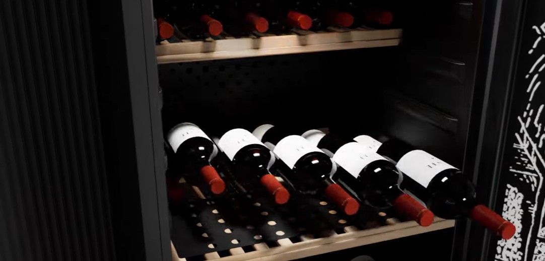Полки в винных шкафах позволяют размещать бутылки для хранения в горизонтальном положении. Это необходимо, чтобы пробка постоянно смачивалась жидкостью и не пересыхала. Плотно закрытая пробка гарантирует, что внутрь бутылки не проникнет наружный воздух. Кислород, содержащийся в воздухе, может стать причиной ухудшения вкуса вина и даже его скисания. Кроме того, горизонтальное положение позволяет лучше оценить количество осадка. Материал изготовления полок выбирается, исходя из требований, предъявляемых к содержанию коллекции вин. Одним из основных требования является отсутствие или максимальное сокращение вибрации и хорошая фиксация бутылок на месте хранения. Даже если полка выдвигается, бутылки должны оставаться на своем месте. Второе требование исключает применение стеклянных полок, как в обычном холодильнике: на них почти невозможно зафиксировать бутылки.