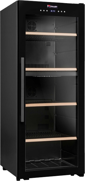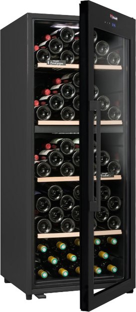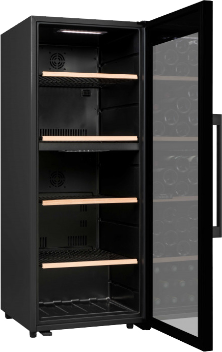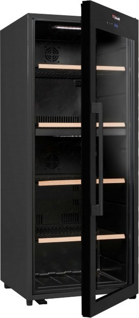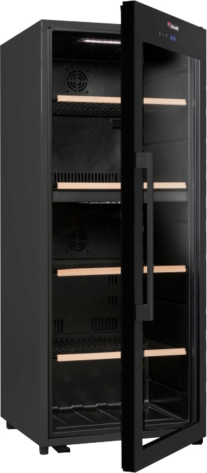 Стеклянная дверь — дополнительный изящный штрих к общему дизайну модели. Специальное покрытие защищает вино от влияния ультрафиолетовых лучей, которые проникают, если шкаф находится в солнечной комнате. Хранение становится еще безопаснее и герметичнее благодаря нескольким слоям стекол. Цвет корпуса — черный.