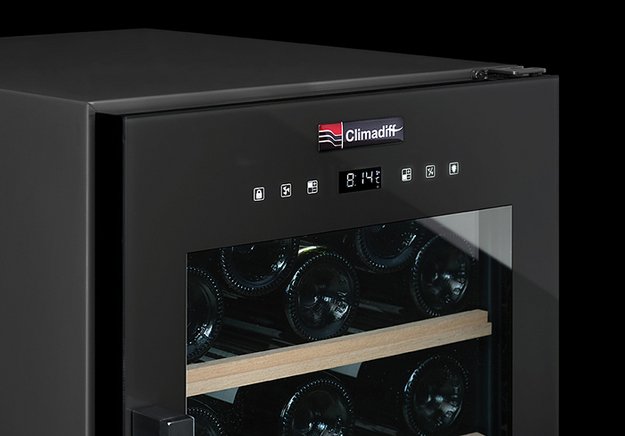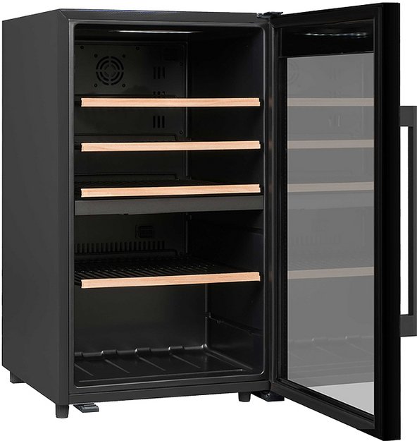 Стеклянная дверь — дополнительный изящный штрих к общему дизайну модели. Специальное покрытие защищает вино от влияния ультрафиолетовых лучей, которые проникают, если шкаф находится в солнечной комнате. Цвет корпуса — черный.