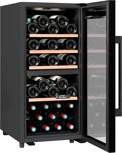 Стеклянная дверь — дополнительный изящный штрих к общему дизайну модели. Специальное покрытие защищает вино от влияния ультрафиолетовых лучей, которые проникают, если шкаф находится в солнечной комнате. Цвет корпуса — черный.