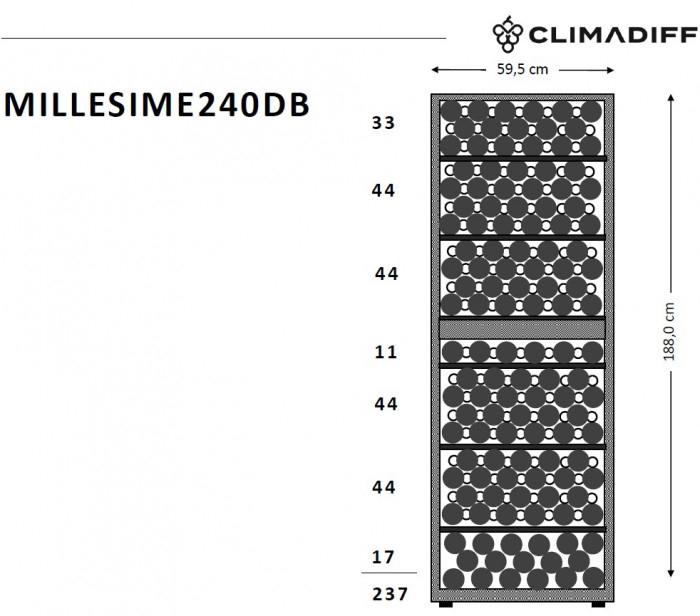 Винный холодильник Climadiff MILLESIME240D имеет две температурные зоны, в которых одновременно можно хранить разные сорта алкоголя и выставлять разные сочетания настроек. Он устанавливается отдельно, что удобно, если у вас есть специальное помещение — кладовая, погреб и т.д. Количество бутылок, которое можно разместить с учетом полной комплектации и из расчета объема бутылки 0,75 л, — 237 шт.