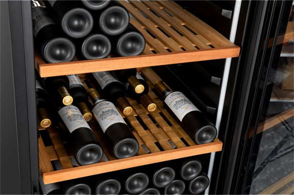 Самым подходящим материалом для изготовления полок, по мнению специалистов, является натуральное не лакированное дерево — бук, дуб, сосна, лиственница. У него множество преимуществ: прежде всего оно способно гасить мелкие вибрации. Дерево хорошо поддается обработке: решетчатые полки, например, позволяют хорошо зафиксировать бутылки, так что они не будут качаться при выдвижении. Кроме того, дерево почти не впитывает запахи и при понижении температуры на нем не образуется конденсат. В некоторых моделях применяются комбинированные полки с металлическим каркасом и деревянными держателями бутылок, а также полностью металлические. Недостаток их — образование конденсата, а значит, изменение уровня влажности, которое может привести также к порче этикеток. Самый бюджетный и наименее эффектный вариант — полки из пластика, имеющие те же недостатки, что и металлические.