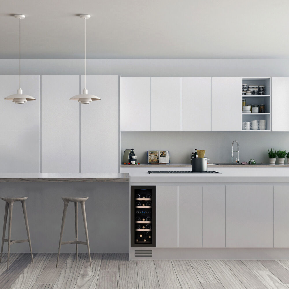 Частичное встраивание отдельно стоящих винных шкафов в нишу — полезная опция, позволяющая сэкономить место в помещении и выбрать лучшее расположение прибора. Устанавливать в нишу или под столешницу рекомендуется только компрессорные модели — другие, например, термоэлектрические, не смогут достаточно вентилироваться при таком расположении. Если винный холодильник оснащен воздухозаборными решетками и радиатором охлаждения в нижней части, он может быть встроен без зазоров. Для удаления нагретого воздуха требуется свободный проход по всей длине холодильника от цоколя до верхней части.