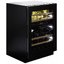 Стеклянная дверь — дополнительный изящный штрих к общему дизайну модели. Специальное покрытие защищает вино от влияния ультрафиолетовых лучей, которые проникают, если шкаф находится в солнечной комнате. Хранение становится еще безопаснее и герметичнее благодаря нескольким слоям стекол. Цвет корпуса — черный матовый. Дверь можно перевесить на другую сторону, поэтому вариантов размещения его в доме становится больше.