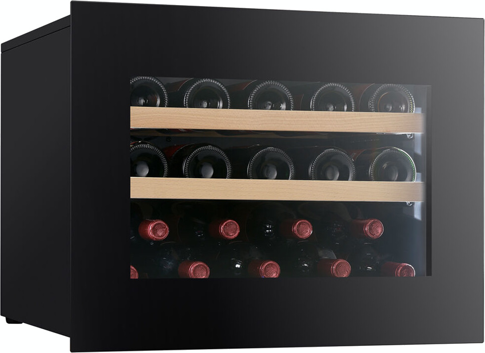 Стеклянная дверь — дополнительный изящный штрих к общему дизайну модели. Специальное покрытие защищает вино от влияния ультрафиолетовых лучей, которые проникают, если шкаф находится в солнечной комнате. Хранение становится еще безопаснее и герметичнее благодаря нескольким слоям стекол. Цвет корпуса — черный матовый. Дверь можно перевесить на другую сторону, поэтому вариантов размещения его в доме становится больше. Доводчик делает открытие и закрытие плавным.