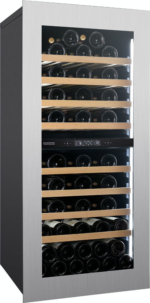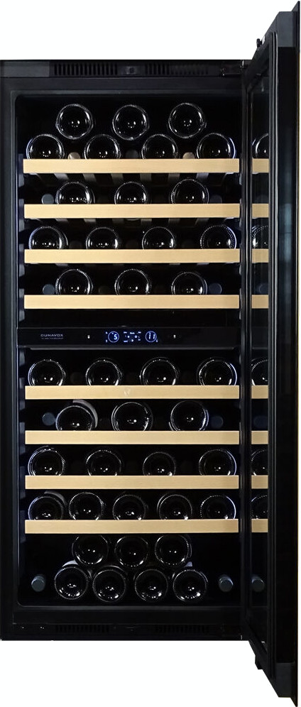 Винный холодильник Dunavox DVH-70.185DC.TO имеет две температурные зоны, в которых одновременно можно хранить разные сорта алкоголя и выставлять разные сочетания настроек. Он встраивается в нишу, что удобно, если у вас ограничен метраж помещения. Количество бутылок, которое можно разместить с учетом полной комплектации и из расчета объема бутылки 0,75 л, — 70 шт.