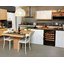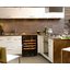 Встраиваемые холодильники для вина оснащаются специальной системой вентиляции: охлаждающая система у них находится в нижней части корпуса спереди. На такие устройства не навешивается мебельный фасад: дверца с затемненным стеклом остается на виду и открывается на достаточно широкий угол для свободного выдвижения деревянных полок.