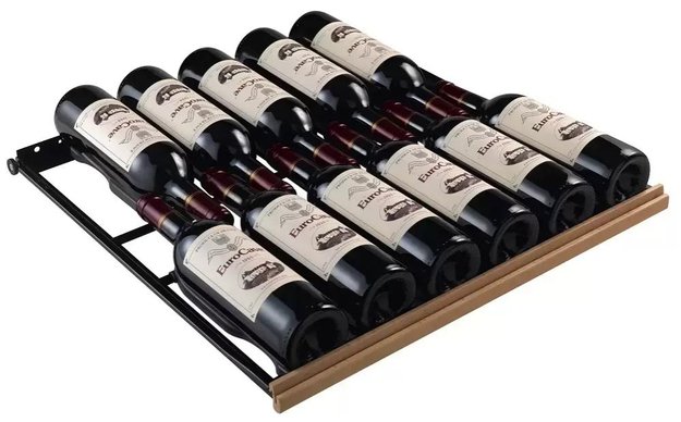Полки в винных шкафах позволяют размещать бутылки для хранения в горизонтальном положении. Это необходимо, чтобы пробка постоянно смачивалась жидкостью и не пересыхала. Плотно закрытая пробка гарантирует, что внутрь бутылки не проникнет наружный воздух. Кислород, содержащийся в воздухе, может стать причиной ухудшения вкуса вина и даже его скисания. Кроме того, горизонтальное положение позволяет лучше оценить количество осадка. Материал изготовления полок выбирается, исходя из требований, предъявляемых к содержанию коллекции вин. Одним из основных требования является отсутствие или максимальное сокращение вибрации и хорошая фиксация бутылок на месте хранения. Даже если полка выдвигается, бутылки должны оставаться на своем месте. Второе требование исключает применение стеклянных полок, как в обычном холодильнике: на них почти невозможно зафиксировать бутылки.