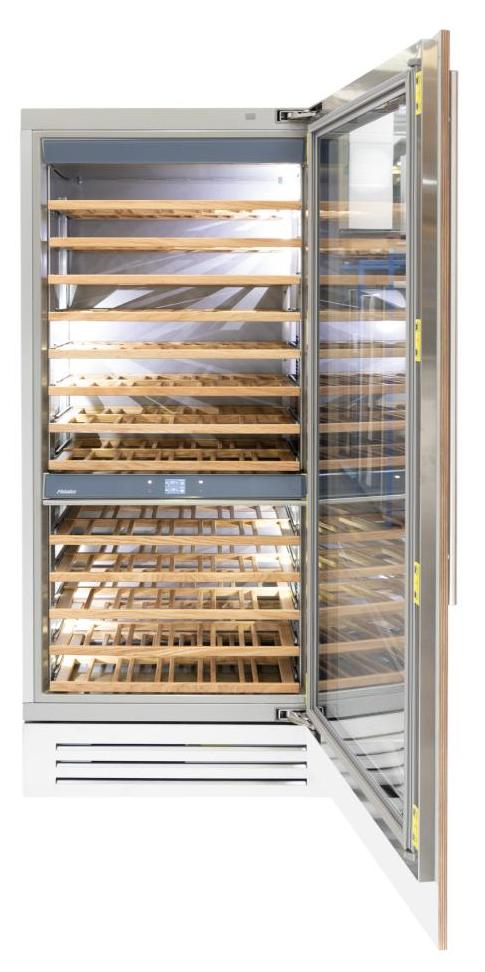 Винный холодильник Fhiaba S900FW6 имеет две температурные зоны, в которых одновременно можно хранить разные сорта алкоголя и выставлять разные сочетания настроек. Он встраивается в нишу, что удобно, если у вас ограничен метраж помещения. Количество бутылок, которое можно разместить с учетом полной комплектации и из расчета объема бутылки 0,75 л, — 156 шт.