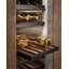 Встраиваемые холодильники для вина оснащаются специальной системой вентиляции: охлаждающая система у них находится в нижней части корпуса спереди. На такие устройства не навешивается мебельный фасад: дверца с затемненным стеклом остается на виду и открывается на достаточно широкий угол для свободного выдвижения деревянных полок.