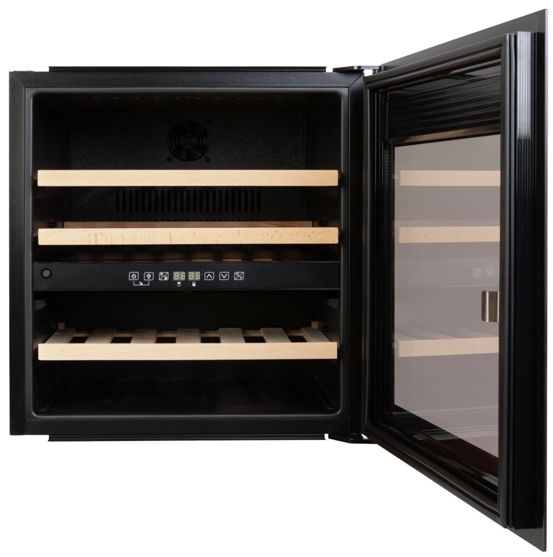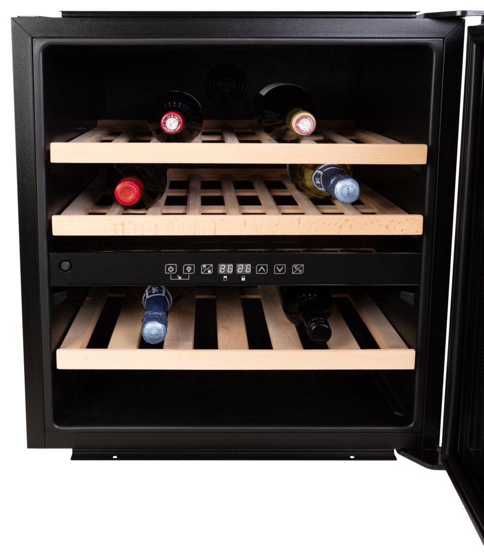 Современные винные шкафы всех типов, в том числе компрессорные, темоэлектрические и абсорбционные, оснащаются электронной системой управления — кнопочной или сенсорной. Панель управления, с помощью которой производится регулировка параметров работы, может размещаться внутри винного шкафа за дверцей или снаружи в верхней части корпуса. Второй вариант более удобен, поскольку для изменения параметров не нужно открывать дверцу. Кроме того, такое расположение панели управления позволяет поддерживать более стабильную температуру в камере. Однако для больших винных шкафов в классическом стиле из ценных пород дерева предпочтительнее скрытая панель управления, которая не портит их внешний вид.