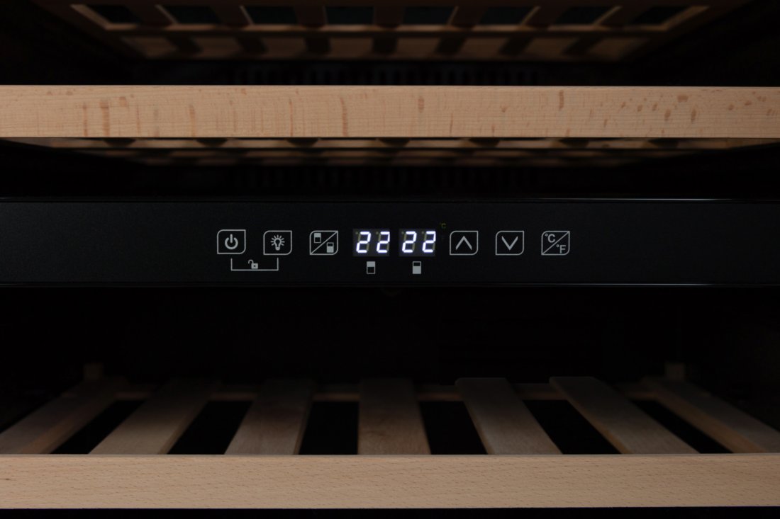 Большинство современных винных шкафов имеет электронное управление, они могут оснащаться обычными цифровыми дисплеями, на которых будет отображаться минимум информации — о включении, температуре в камере и возникших неисправностях. Однако в большинстве моделей используются текстовые сенсорные дисплеи из нескольких сегментов. С помощью кнопок сенсорного меню на этих дисплеях можно отображать и регулировать температуру в каждой зоне отдельно с точностью до градуса, выбирать уровень влажности, задавать дополнительные опции — отключение сигнализации, включение вентиляции и внутреннего освещения, активацию защиты от детей, тип отображения температуры ºF/ºC. Здесь же будут появляться коды ошибок, выданные системой обнаружения неисправностей.