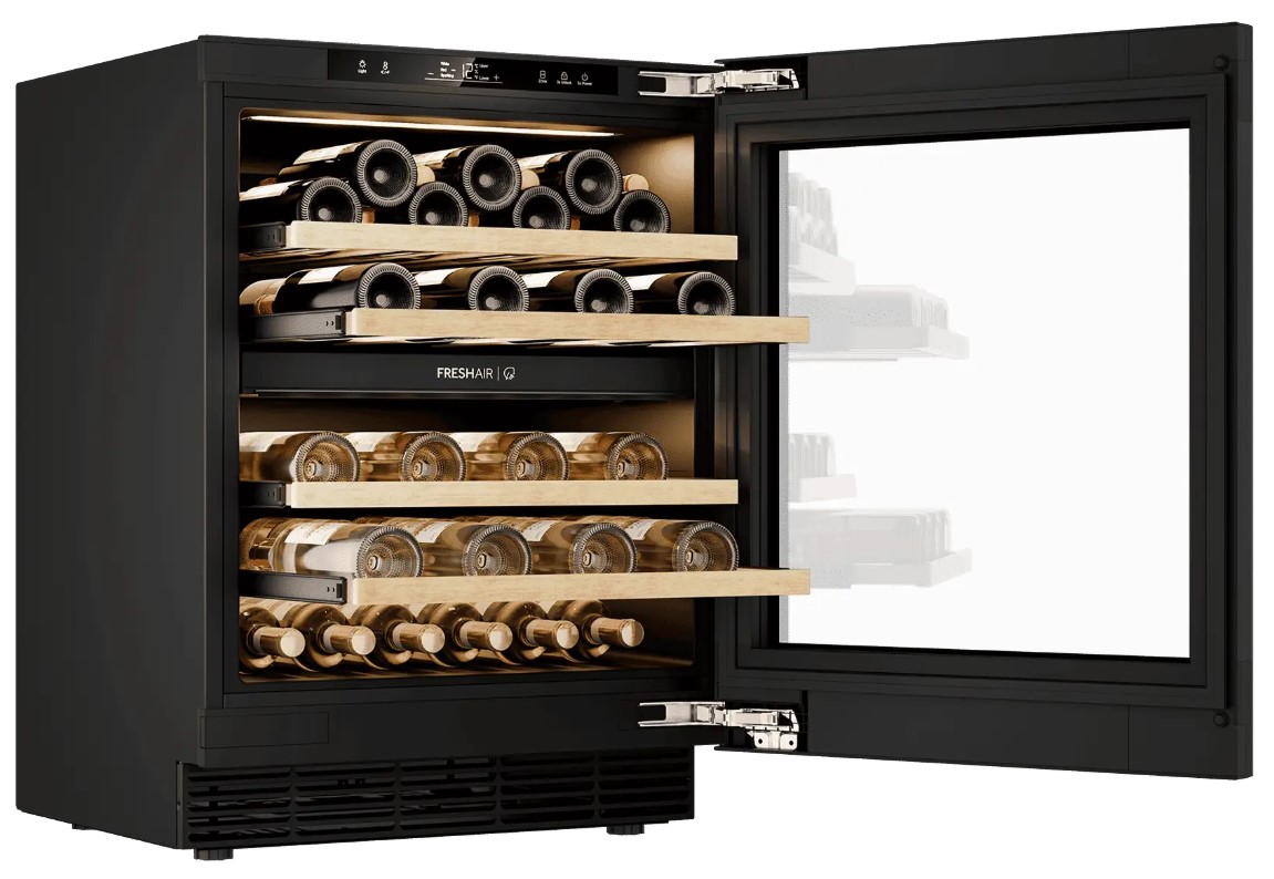 Встраиваемые холодильники для вина оснащаются специальной системой вентиляции: охлаждающая система у них находится в нижней части корпуса спереди. На такие устройства не навешивается мебельный фасад: дверца с затемненным стеклом остается на виду и открывается на достаточно широкий угол для свободного выдвижения деревянных полок.