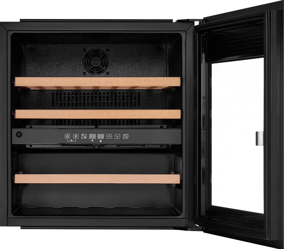 Современные винные шкафы всех типов, в том числе компрессорные, темоэлектрические и абсорбционные, оснащаются электронной системой управления — кнопочной или сенсорной. Панель управления, с помощью которой производится регулировка параметров работы, может размещаться внутри винного шкафа за дверцей или снаружи в верхней части корпуса. Второй вариант более удобен, поскольку для изменения параметров не нужно открывать дверцу. Кроме того, такое расположение панели управления позволяет поддерживать более стабильную температуру в камере. Однако для больших винных шкафов в классическом стиле из ценных пород дерева предпочтительнее скрытая панель управления, которая не портит их внешний вид.