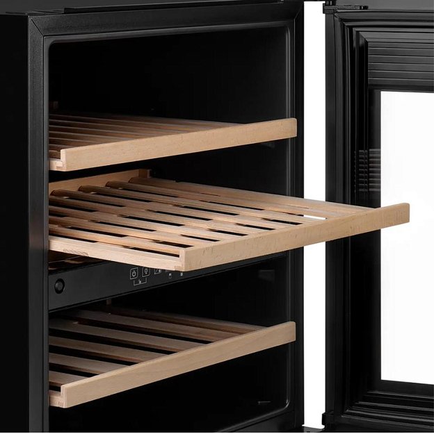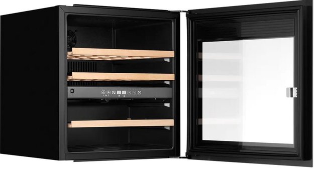Электронное управление помогает быстро разобраться в том, как функционирует эта модель, и легко настроить все необходимые параметры. На дисплее отображаются данные, которые собирают датчики в камере. Лампочки, расположенные внутри, хорошо подсвечивают бутылки. Всего полок, на которых можно разместить коллекцию, в шкафу 3 шт.