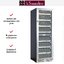Производители предлагают винные шкафы, оснащенные одной, двумя, тремя и четырьмя камерами, которые могут располагаться как друг под другом, так бок и бок. Самые популярные — однокамерные модели, ассортимент которых особенно широк, но втором месте — двухкамерные. Над заметить, что количество камер не зависит напрямую от габаритов изделия: например, однокамерные модели увеличенных габаритов — далеко не редкость. Их высота может варьироваться в пределах от 14 см до 219 см, а ширина — от 13 см до 150 см.