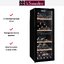 Производители предлагают винные шкафы, оснащенные одной, двумя, тремя и четырьмя камерами, которые могут располагаться как друг под другом, так бок и бок. Самые популярные — однокамерные модели, ассортимент которых особенно широк, но втором месте — двухкамерные. Над заметить, что количество камер не зависит напрямую от габаритов изделия: например, однокамерные модели увеличенных габаритов — далеко не редкость. Их высота может варьироваться в пределах от 14 см до 219 см, а ширина — от 13 см до 150 см.