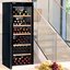 Современные винные шкафы всех типов, в том числе компрессорные, темоэлектрические и абсорбционные, оснащаются электронной системой управления — кнопочной или сенсорной. Панель управления, с помощью которой производится регулировка параметров работы, может размещаться внутри винного шкафа за дверцей или снаружи в верхней части корпуса. Второй вариант более удобен, поскольку для изменения параметров не нужно открывать дверцу. Кроме того, такое расположение панели управления позволяет поддерживать более стабильную температуру в камере. Однако для больших винных шкафов в классическом стиле из ценных пород дерева предпочтительнее скрытая панель управления, которая не портит их внешний вид.