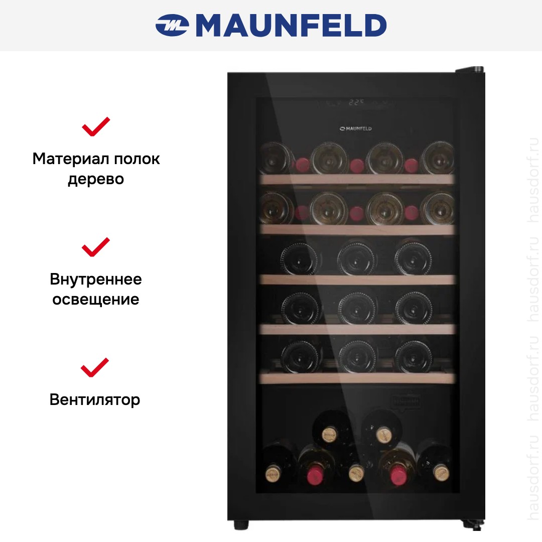 Винный холодильник Maunfeld MFWC-124S56 имеет одну температурную зону, в которой можно разместить бутылки и единовременно выставить только одну комбинацию настроек. Он устанавливается отдельно, что удобно, если у вас есть специальное помещение — кладовая, погреб и т.д. Благодаря компактным размерам данная модель — отличный выбор для офиса, гостиничного номера. Количество бутылок, которое можно разместить с учетом полной комплектации и из расчета объема бутылки 0,75 л, — 56 шт.