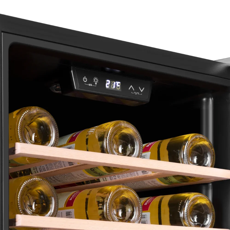 Большинство современных винных шкафов имеет электронное управление, они могут оснащаться обычными цифровыми дисплеями, на которых будет отображаться минимум информации — о включении, температуре в камере и возникших неисправностях. Однако в большинстве моделей используются текстовые сенсорные дисплеи из нескольких сегментов. С помощью кнопок сенсорного меню на этих дисплеях можно отображать и регулировать температуру в каждой зоне отдельно с точностью до градуса, выбирать уровень влажности, задавать дополнительные опции — отключение сигнализации, включение вентиляции и внутреннего освещения, активацию защиты от детей, тип отображения температуры ºF/ºC. Здесь же будут появляться коды ошибок, выданные системой обнаружения неисправностей.