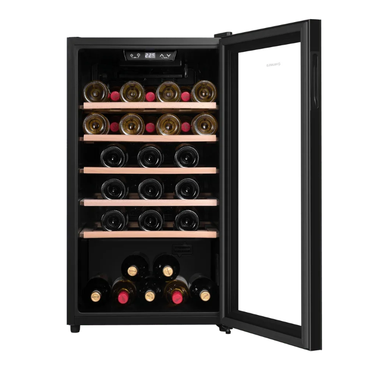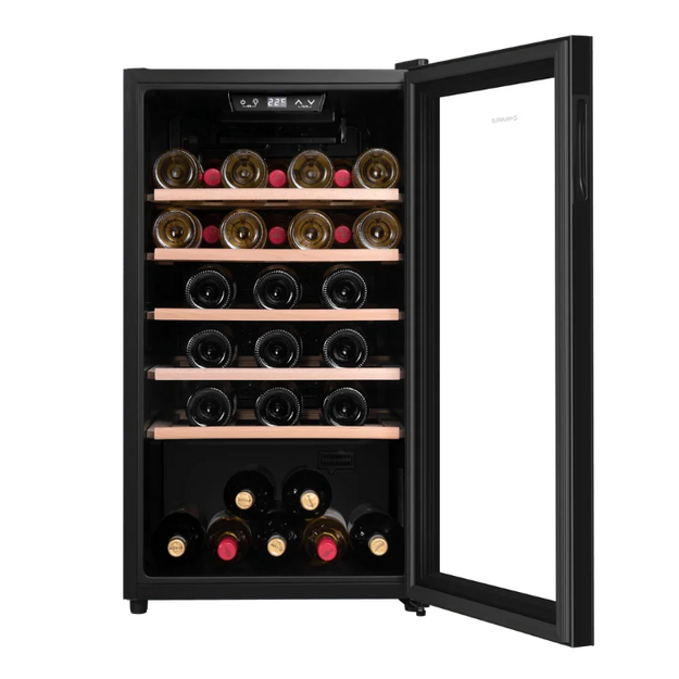 Стеклянная дверь — дополнительный изящный штрих к общему дизайну модели. Специальное покрытие защищает вино от влияния ультрафиолетовых лучей, которые проникают, если шкаф находится в солнечной комнате. Цвет корпуса — черный.