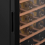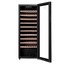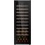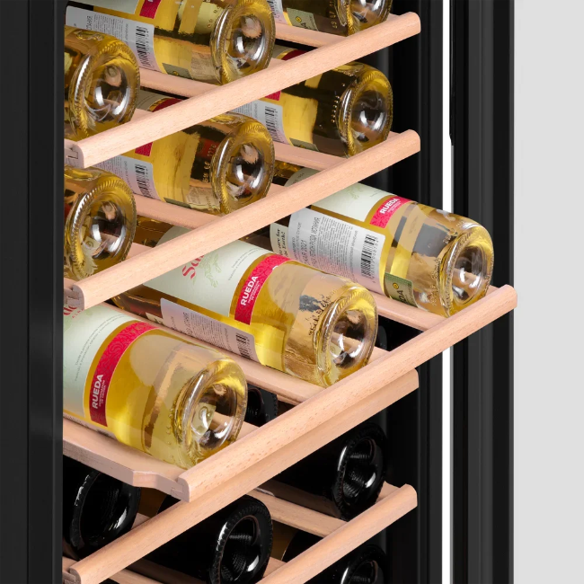 Стеклянная дверь — дополнительный изящный штрих к общему дизайну модели. Специальное покрытие защищает вино от влияния ультрафиолетовых лучей, которые проникают, если шкаф находится в солнечной комнате. Цвет корпуса — черный.