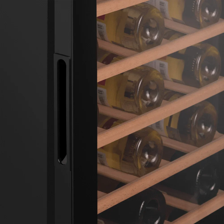 Вид и расположение ручки на дверце винного шкафа зависит прежде всего от дизайна и стиля изделия. В классических холодильниках со корпусом из дерева чаще всего используется внешняя ручка «под старину», изготовленная из металла — например, латуни, под бронзу или медь. Модели в современном стиле оснащаются внешними ручками из металла, выполненными в минималистическом стиле, или скрытыми ручками, создающими снаружи гладкую поверхность, за которой легко ухаживать. Некоторые производители предлагают винные шкафы без ручек: дверца у них открывается нажатием на среднюю или верхнюю часть.
