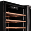 Стеклянная дверь — дополнительный изящный штрих к общему дизайну модели. Специальное покрытие защищает вино от влияния ультрафиолетовых лучей, которые проникают, если шкаф находится в солнечной комнате. Цвет корпуса — черный.