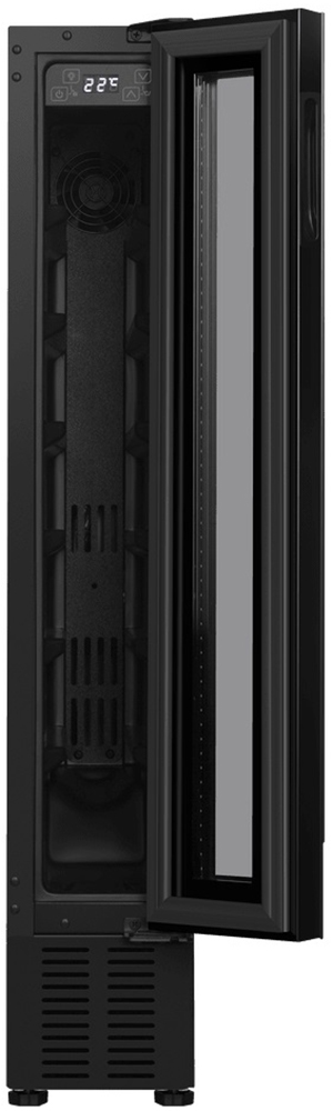 Встраиваемые холодильники для вина оснащаются специальной системой вентиляции: охлаждающая система у них находится в нижней части корпуса спереди. На такие устройства не навешивается мебельный фасад: дверца с затемненным стеклом остается на виду и открывается на достаточно широкий угол для свободного выдвижения деревянных полок.