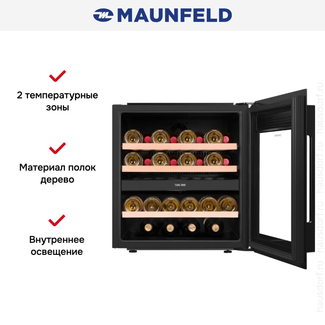 Винный холодильник Maunfeld MBWC-92DM36 имеет две температурные зоны, в которых одновременно можно хранить разные сорта алкоголя и выставлять разные сочетания настроек. Он встраивается в нишу, что удобно, если у вас ограничен метраж помещения. Благодаря компактным размерам данная модель — отличный выбор для офиса, гостиничного номера. Количество бутылок, которое можно разместить с учетом полной комплектации и из расчета объема бутылки 0,75 л, — 36 шт.