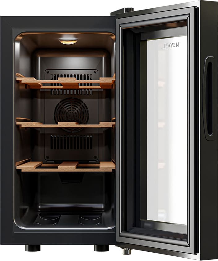 Стеклянная дверь — дополнительный изящный штрих к общему дизайну модели. Специальное покрытие защищает вино от влияния ультрафиолетовых лучей, которые проникают, если шкаф находится в солнечной комнате. Хранение становится еще безопаснее и герметичнее благодаря нескольким слоям стекол. Цвет корпуса — черный.