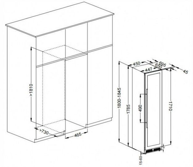 Высота встраиваемых винных шкафов может варьироваться примерно в таком же диапазоне. Стандартные размеры встраиваемых винных шкафов должна соответствовать габаритам мебели, так что высота их может быть несколько меньше, чем у отдельно стоящих моделей.