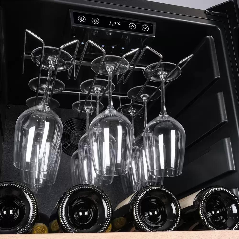Стеклянная дверь — дополнительный изящный штрих к общему дизайну модели. Специальное покрытие защищает вино от влияния ультрафиолетовых лучей, которые проникают, если шкаф находится в солнечной комнате. Хранение становится еще безопаснее и герметичнее благодаря нескольким слоям стекол. Цвет корпуса — черный.
