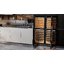 Встраиваемые холодильники для вина оснащаются специальной системой вентиляции: охлаждающая система у них находится в нижней части корпуса спереди. На такие устройства не навешивается мебельный фасад: дверца с затемненным стеклом остается на виду и открывается на достаточно широкий угол для свободного выдвижения деревянных полок.