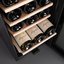Электронное управление помогает быстро разобраться в том, как функционирует эта модель, и легко настроить все необходимые параметры. На дисплее отображаются данные, которые собирают датчики в камере. Лампочки, расположенные внутри, хорошо подсвечивают бутылки. Всего полок, на которых можно разместить коллекцию, в шкафу 5 шт.