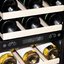 Встраиваемые холодильники для вина оснащаются специальной системой вентиляции: охлаждающая система у них находится в нижней части корпуса спереди. На такие устройства не навешивается мебельный фасад: дверца с затемненным стеклом остается на виду и открывается на достаточно широкий угол для свободного выдвижения деревянных полок.