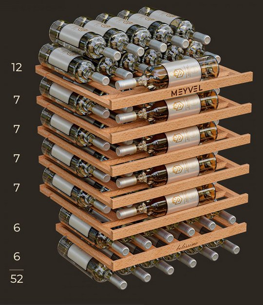 Винный холодильник Meyvel MV52PRO-KBB1 имеет одну температурную зону, в которой можно разместить бутылки и единовременно выставить только одну комбинацию настроек. Он встраивается в нишу, что удобно, если у вас ограничен метраж помещения. Благодаря компактным размерам данная модель — отличный выбор для офиса, гостиничного номера. Количество бутылок, которое можно разместить с учетом полной комплектации и из расчета объема бутылки 0,75 л, — 52 шт.
