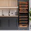 Встраиваемые холодильники для вина оснащаются специальной системой вентиляции: охлаждающая система у них находится в нижней части корпуса спереди. На такие устройства не навешивается мебельный фасад: дверца с затемненным стеклом остается на виду и открывается на достаточно широкий угол для свободного выдвижения деревянных полок.